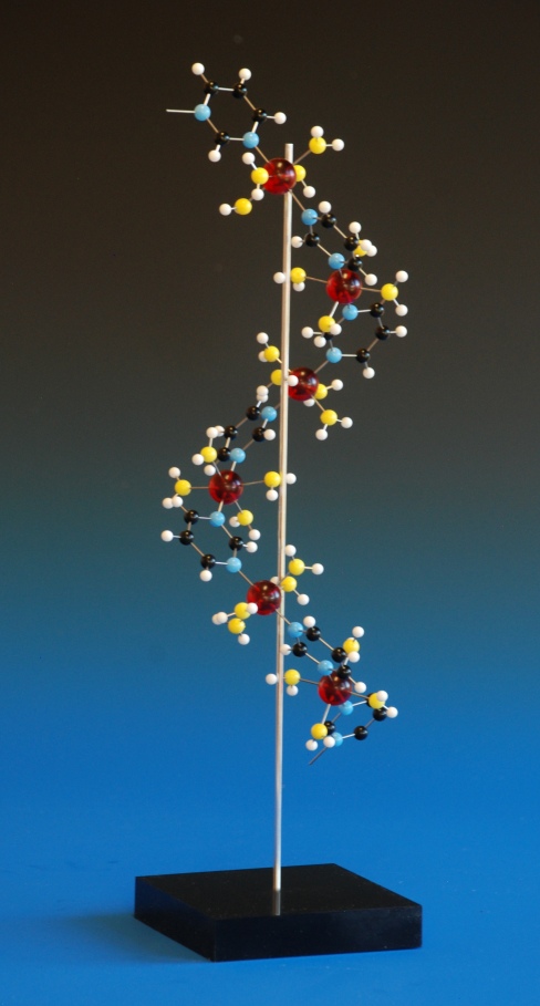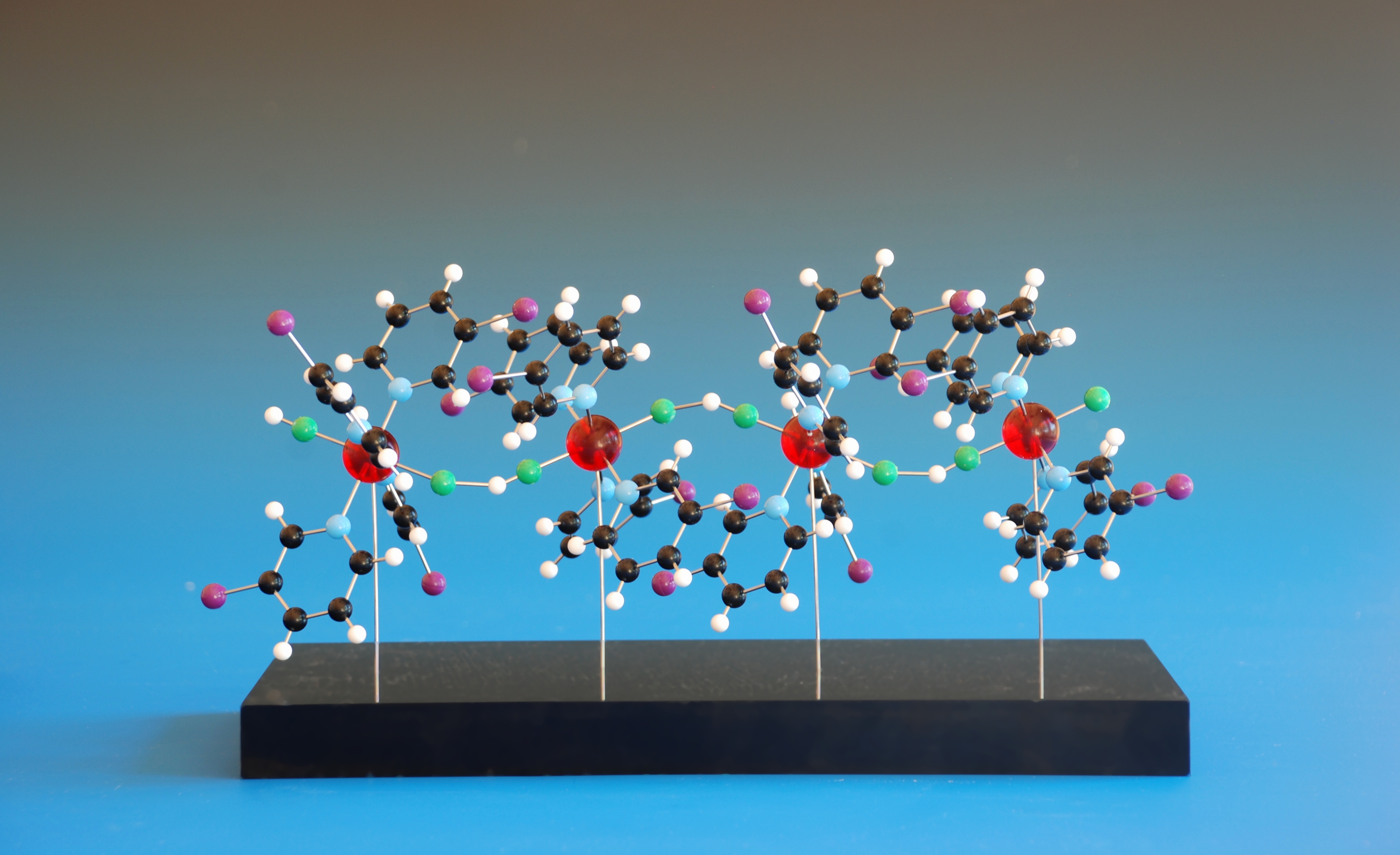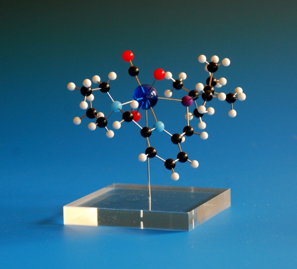 Although inorganic molecular compounds are generally regarded as molecules that don't contain any C-H bonds, this definition is neither rigorous or particularly useful and we tend to include metallo-organic compounds, complexes and other similar compounds in this group - in short, any molecule that isn't obviously simply organic. By their nature, it is difficult to systematically organise these compounds but this page contains a good sample of the type of molecules that we have made. Because they are generally small and discrete, many of these models have been given in presentations to students, visiting speakers and retiring colleagues, and so are shown here mounted on bases.